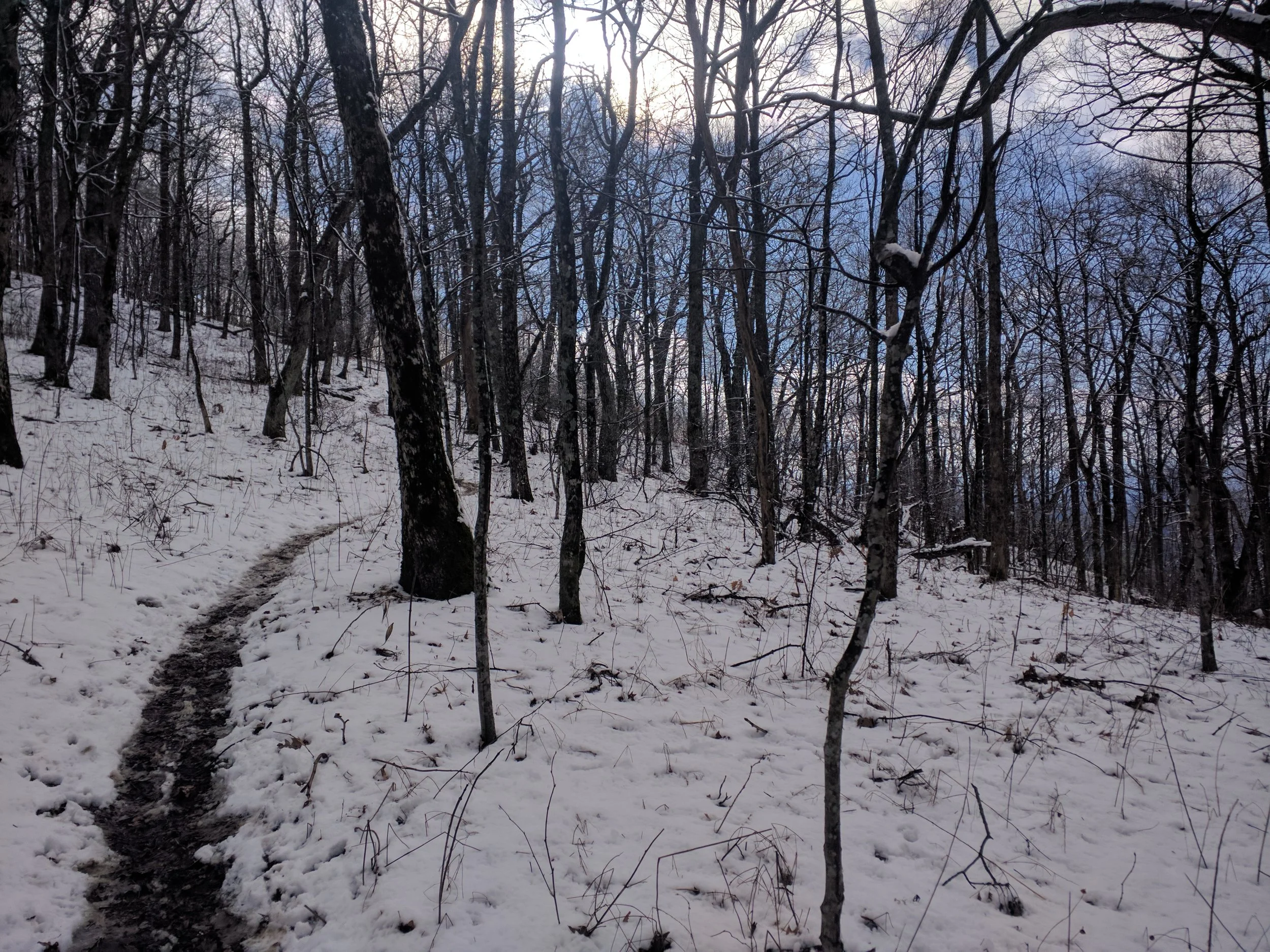 We got light snow and high winds all day today. It is still kind of fun to hike in the snow once you get moving and warm up. It's just that transition from sleeping to packing up to hiking that sucks. I tried making a snow angel, but it was too icy and I didn't want to tear up my rain gear. As the day went on Head First and I decided we would rather hike the extra four miles to Winding Stairs and get off there today. It hits a more major road and it made us feel better to get it over with since we were hitting town a day early. When we got to Rock Gap we hit more trail magic. More hot dogs and soda, and another group brought some beer. I begrudgingly skipped a Yuengling because I still had the four miles to do. A beer would have zapped me I think. I can't get Yuengling at home, so it was probably the worst part of the day having to say no as I looked on despondently at the others drinking and quitting for the day. I'm glad we pushed on though. New high score! We finished like champions today. The ending couldn't have been more serendipitous. We stepped off the trail and less than 30 seconds later a woman named Hiccup pulled right in and asked if we needed a ride to town. Marvelous.